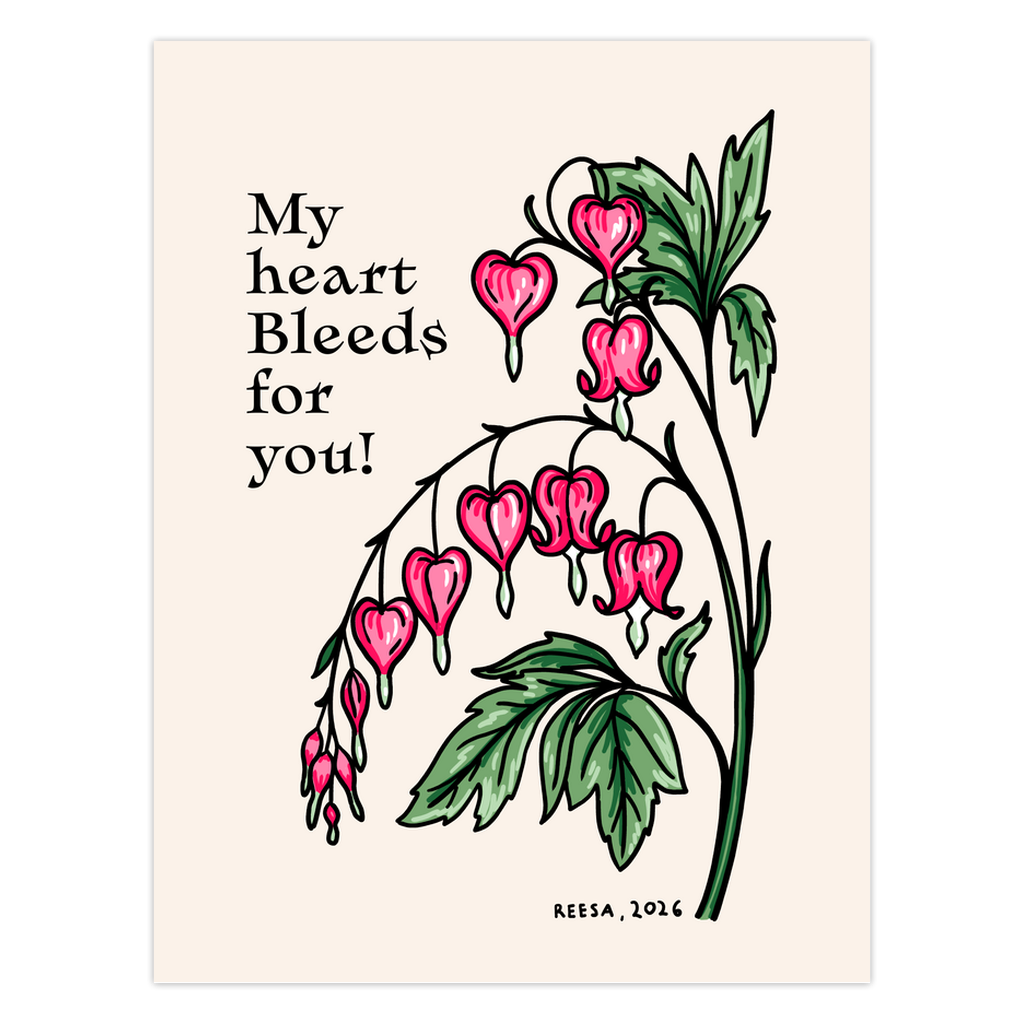My heart bleeds for you! Cause they're bleeding hearts...so cute. These high quality printed paper cards come pre-folded, packed in a cello sleeve with a white envelope. They're blank inside cause...well, I don't know you like that!