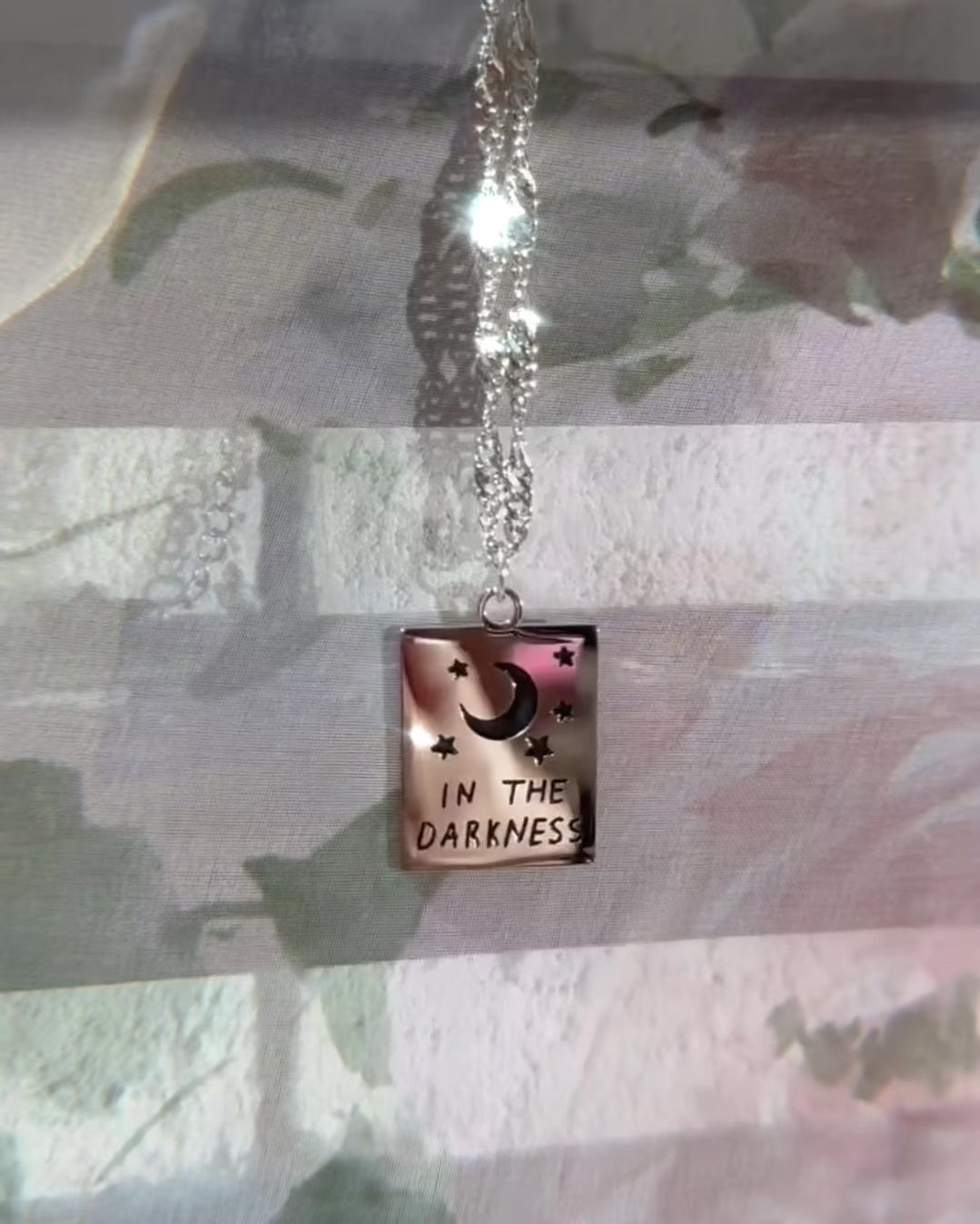 This double-sided pendant necklace reads "In the darkness" on one side, and "I see my light" on the other.