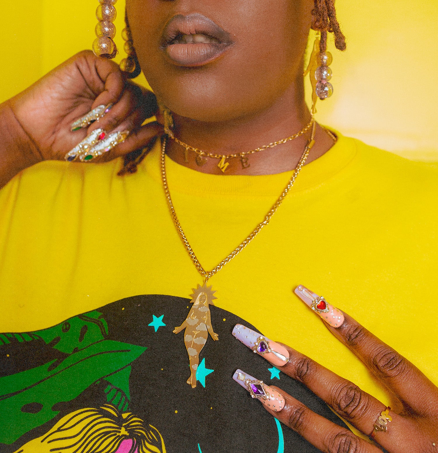 18k gold plated stainless steel charm on a simple jump ring. The sun is 3" from the crown of her head to the soles of her feet.